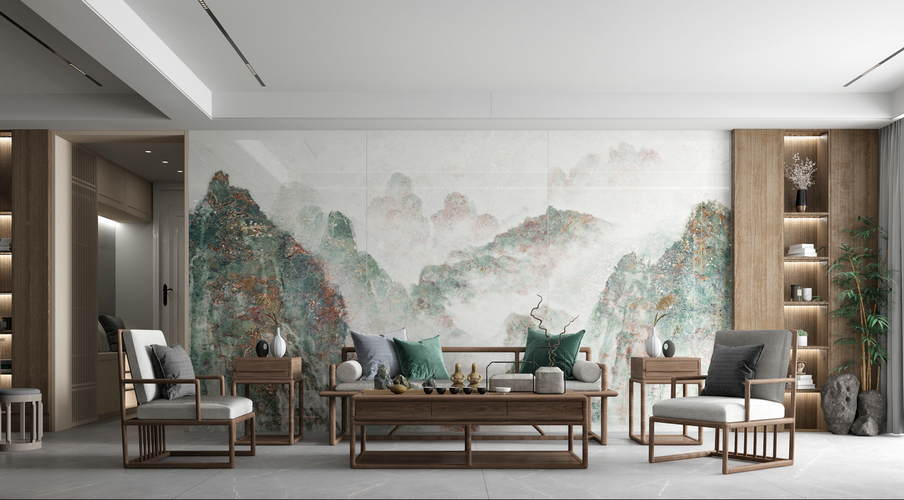 設計源于藝術感十足的山水石材,山水畫紋理交融在一起,猶如暮靄中的遠山,給人一種不是真山真水,卻恰是山水的心境,正如“妙在似與不似之間”。